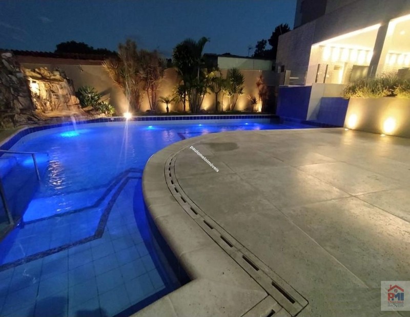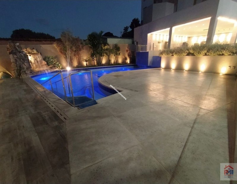 Piscina aquecida com capacidade para 140 mil litros de água, com cascata e iluminação.